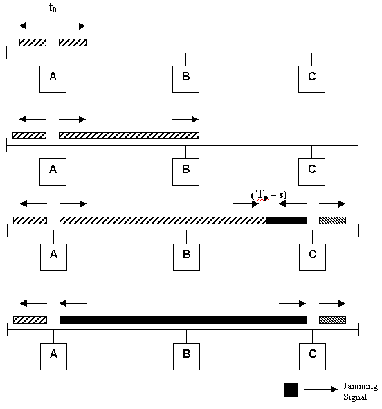 - A seguir, inícia a transmissão. Entretanto, outro pc pode ter nesse mesmo instante começado a transmitir. Então dá-se uma "colisão" de transmissão - não é possível enviar duas transmissões simultâneas - a rede trabalha em banda base.